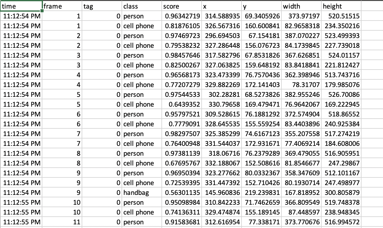 The final output for real time object detection is shown in an example below (see figure below). For each frame the model tracks, if the model finds one or more objects, it will return the class/category (person, couch, etc), statistics of the bounding box, and the confidence score of the object. We will then record the user's local time (for the webcam recording) or the video time (of the user uploaded video) when the frame was tracked, the number of the frame (since the beginning of the recording), the category/class and confidence score of the object, and the X & Y coordinates, width and height of the bounding box. Each line in the output file corresponds to one object in one frame. For frames where no objects are detected, we omit them in the final output.
